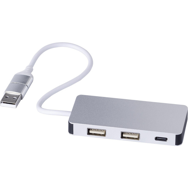 Stazione Hub USB in alluminio riciclato, include due porte USB A, una porta USB C, logo 'materiale riciclato' inciso sul davanti