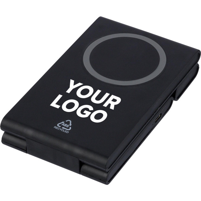 Stazione di ricarica wireless 3-in-1 in ABS riciclato, progettata per smartphone, smartwatch e auricolari. Presenta un design ultra-piatto con supporto pieghevole e uscite di ricarica: telefono 15W, AirPods 5W e iWatch 2W. Include ingressi da 5V/3A o 9V/3A e un'uscita fino a 9V/1,67A. Confezionata singolarmente in una scatola in cartone avana.