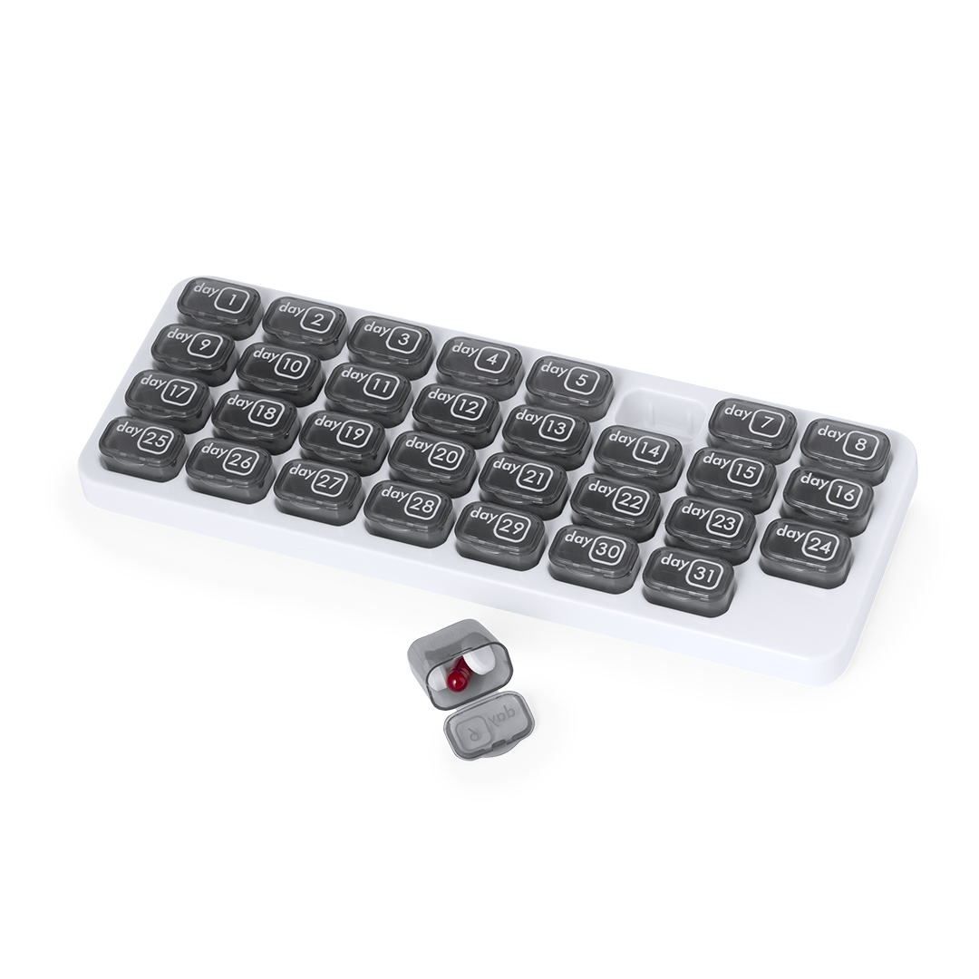 Originale portapillole mensile in resistente PP. Organizzatore con 31 scomparti indipendenti e rimovibili per conservare tutte le pillole necessarie giorno per giorno. Elegante base bianca e scatole grigie con l'indicazione del giorno del mese. Presentato in un sacchetto individuale.