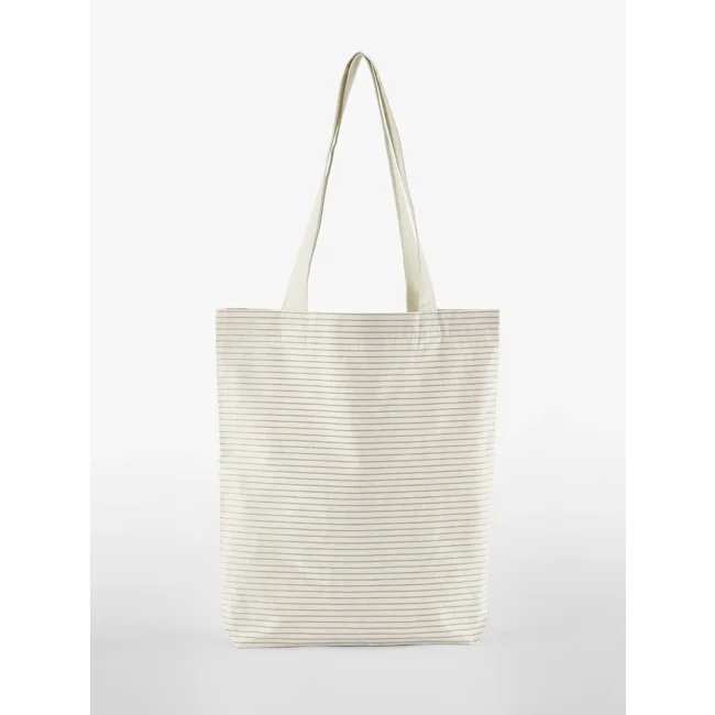 100% cotone organico. Shopper a righe in cotone organico certificato GOTS - CU811033, può essere portata a mano o in spalla. Etichetta removibile. Lunghezza manici: 67 cm. Dimensioni: 29x42x8 cm, capacità: 10 litri, area stampabile: 27x36 cm.