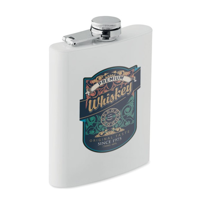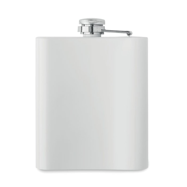 Fiaschetta sottile in acciaio inox riciclato (90% acciaio inox riciclato e 10% acciaio inox) con strato per sublimazione. Singolo strato. Capacità: 190 ml.