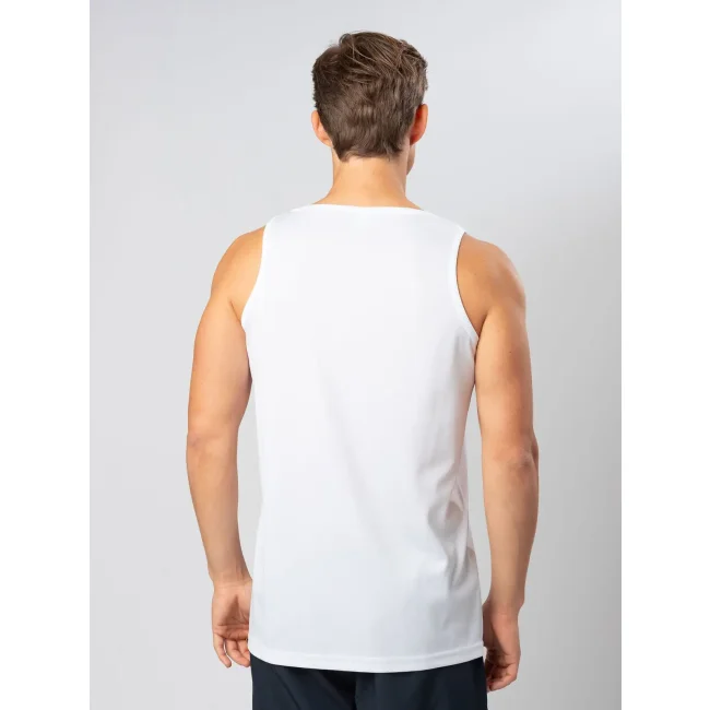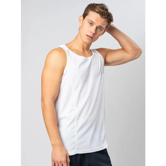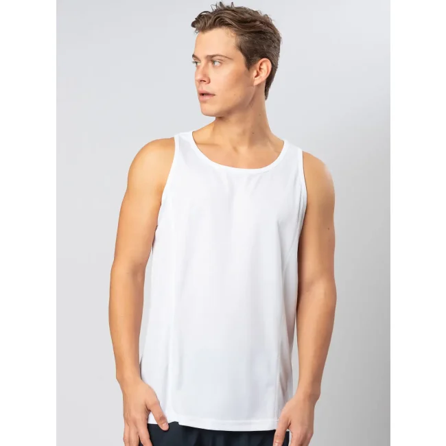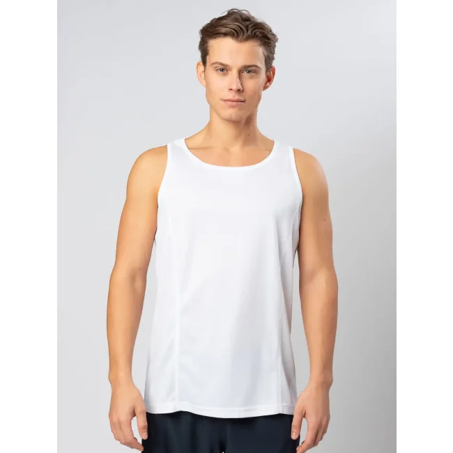 100% poliestere. Canotta tecnica, tessuto traspirante per massimo comfort e facilità di lavaggio, vestibilità comoda, etichetta strappabile. Senza cuciture laterali. Adatta alla sublimazione allover.