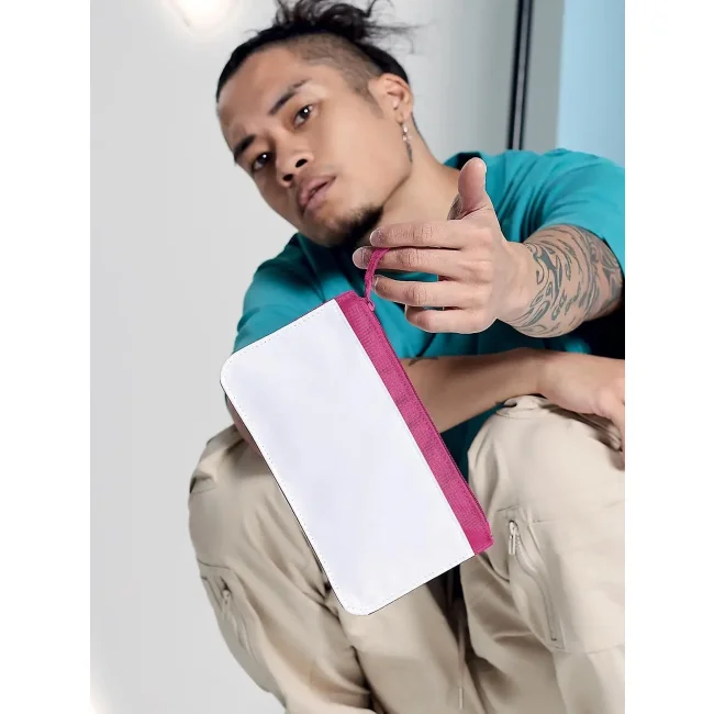 100% poliestere 300d/600d. Astuccio con superficie adatta alla sublimazione, tasca principale con zip. Dimensioni: 21 x 12 cm, area di stampa: 21 x 10 cm.