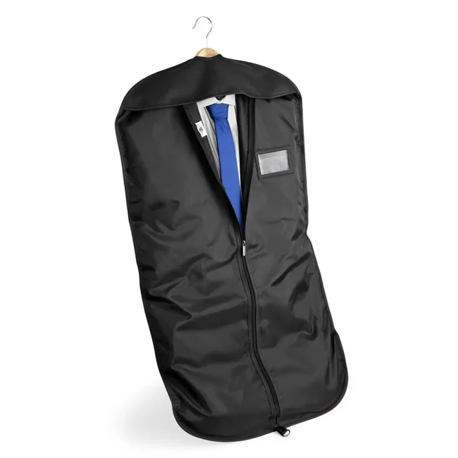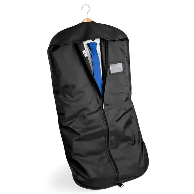 100% poliestere 210d. Porta abiti con chiusra zip su tutta la lunghezza, finestra per etichetta identificativa, gancio per gruccia. Etichetta removibile. Dimensioni: 60 x 100 cm, area stampabile: 23 x 70 cm.