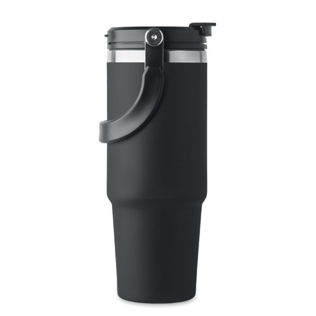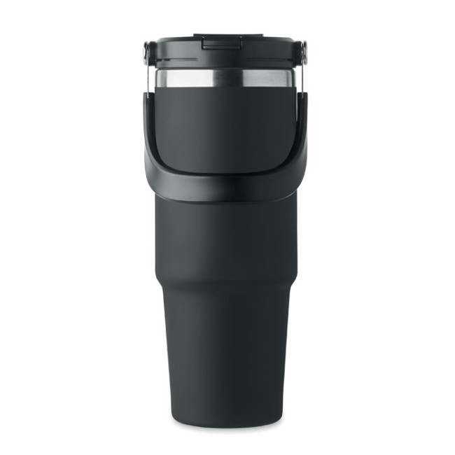 Bicchiere a doppio strato in acciaio inox riciclato (90% acciaio inox riciclato e 10% acciaio inox) con coperchio con cannuccia interna, imboccatura pieghevole e apertura per bere direttamente. Capacità 850 ml.