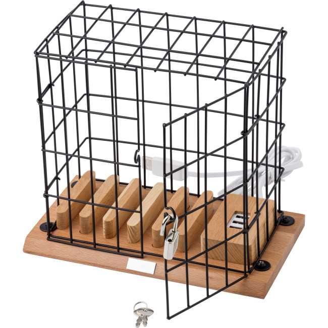 Supporto per smartphone in gabbia, in legno ed alluminio, include porte USB e lucchetto con chiavi, adatto per la maggior parte dei device in commercio