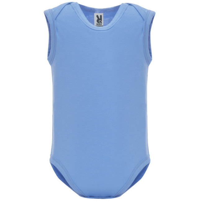 Body neonato con bretelle single jersey. Girocollo, giromanica e parte inferiore rifiniti in costina 1x1. Chiusura con bottone a pressione sull'inguine. Apertura incrociata della spalla.
