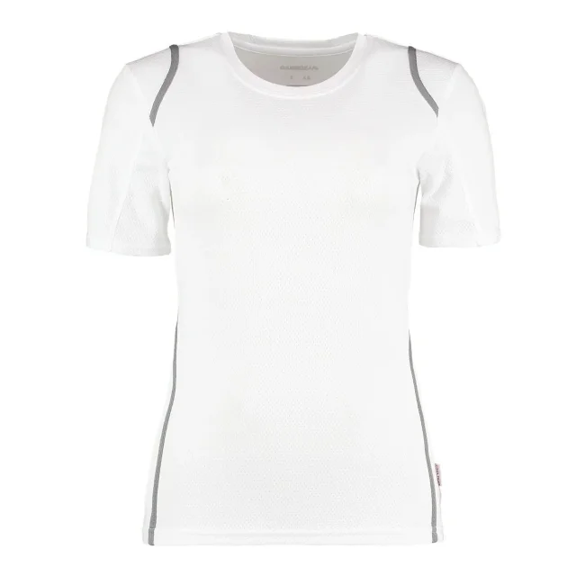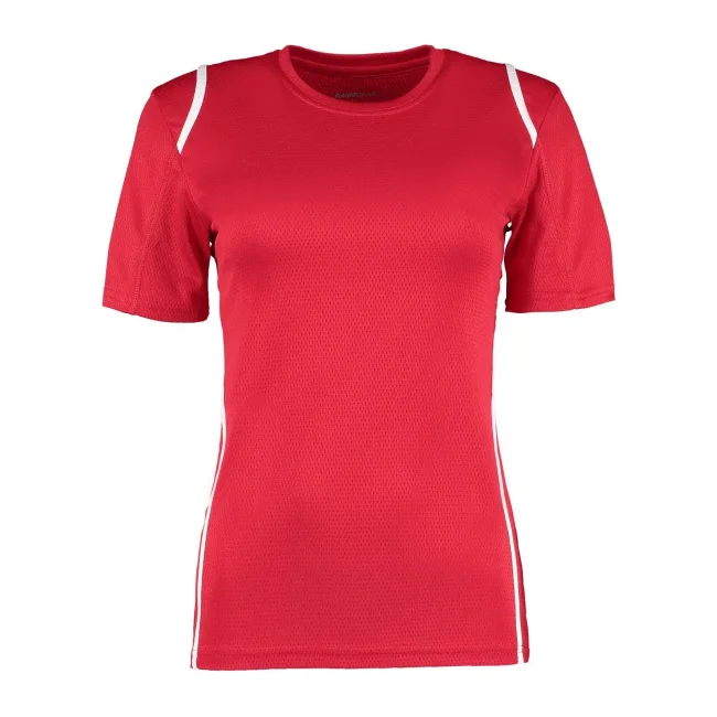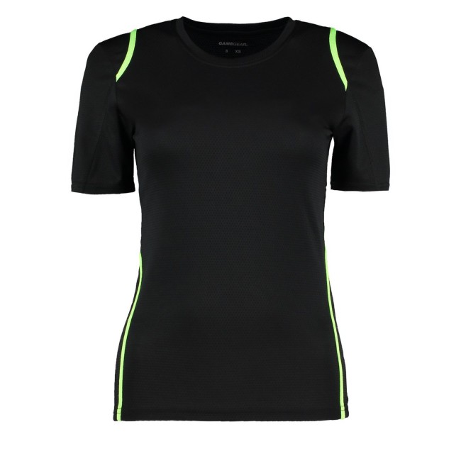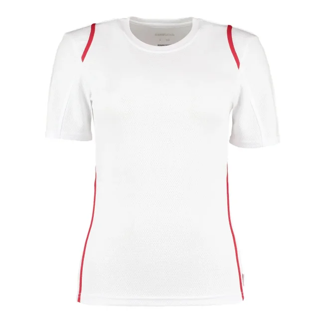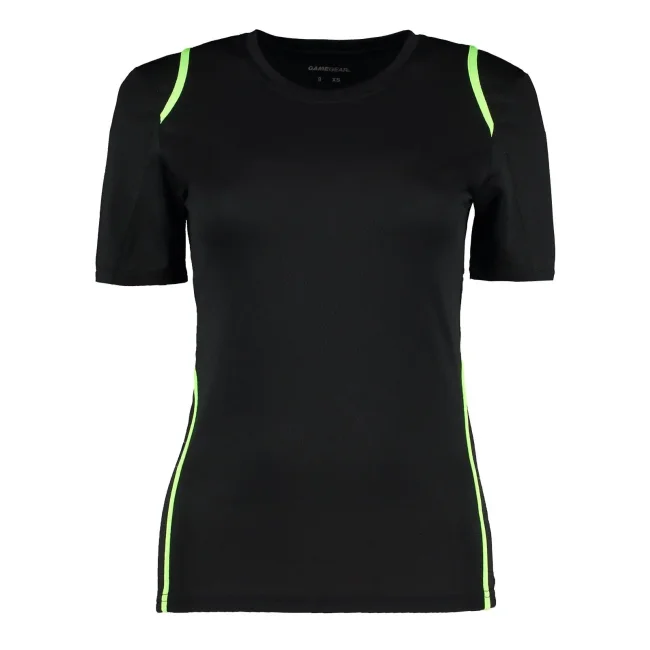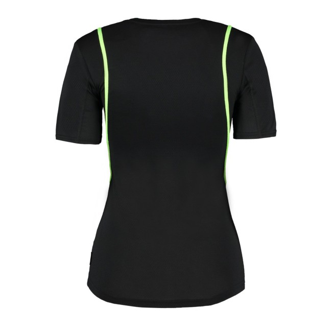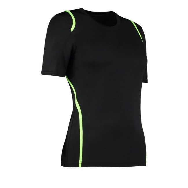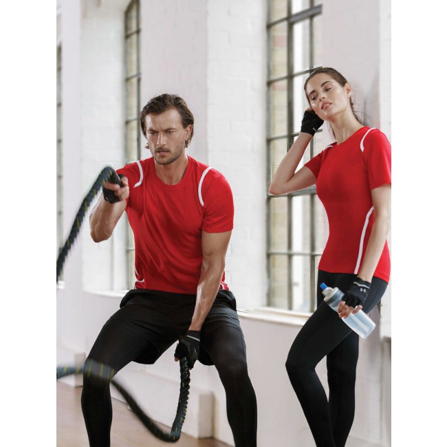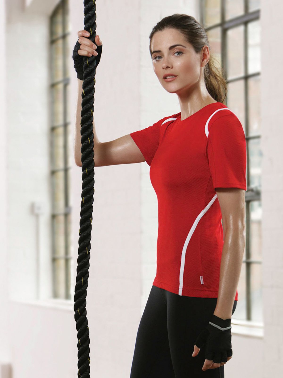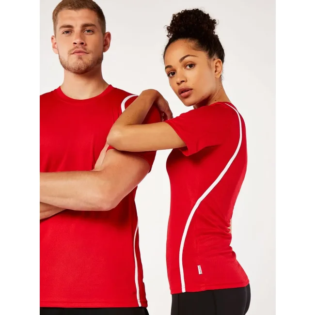 100% poliestere. T-shirt maniche corte set-in, traspirante, girocollo con fettuccia interna, sottili inserti in contrasto su spalle, schiena e fianchi, struttura con cuciture laterali, leggermente sfiancata.