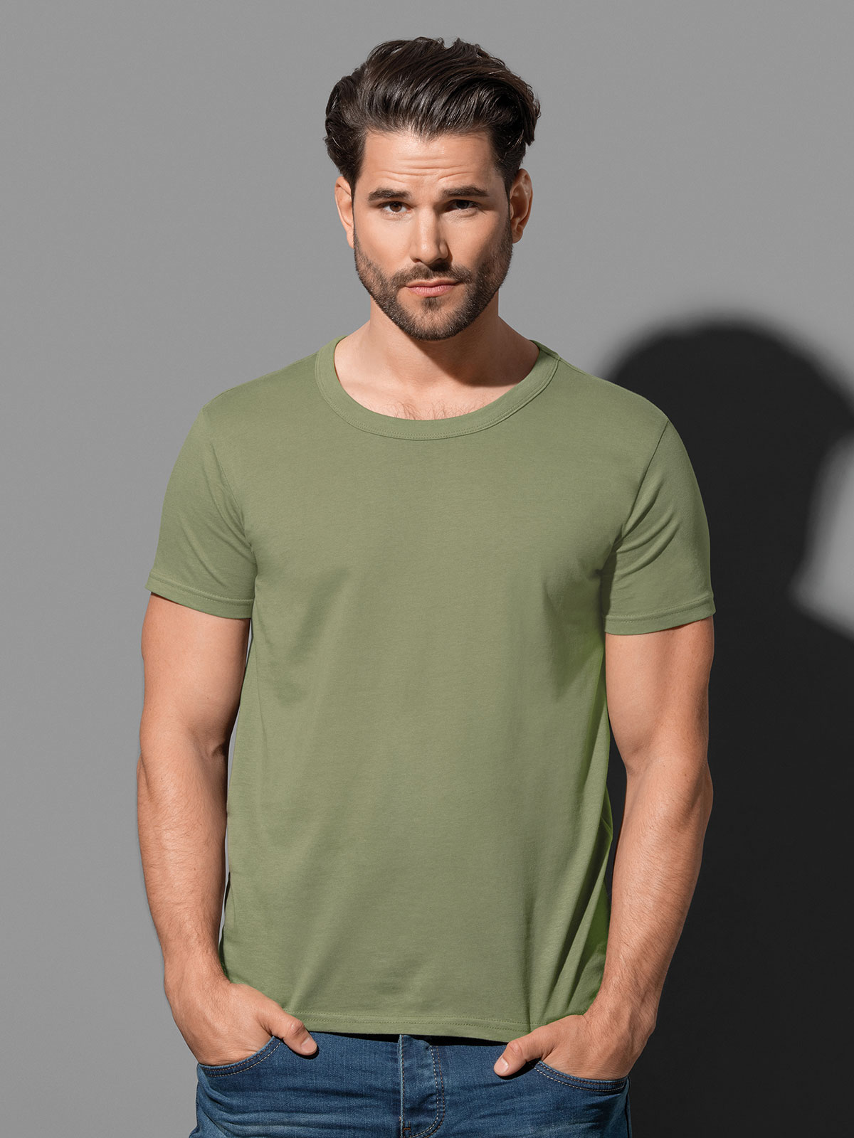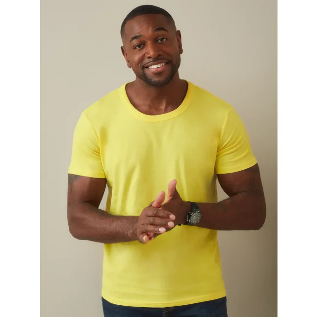 100% cotone ring-spun single jersey. T-shirt manica corta girocollo con bordo a costine orlato, struttura con cuciture laterali, etichetta strappabile, lavabile a 40°C. Col. GYH: 85% cot. 15% visc.