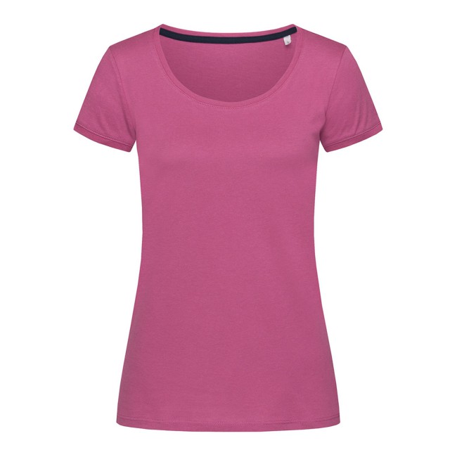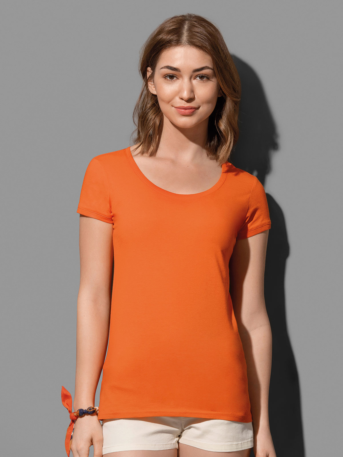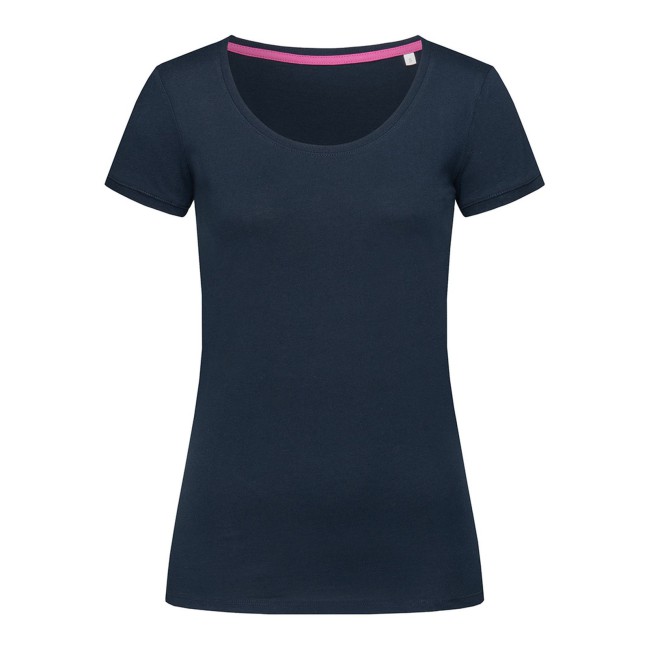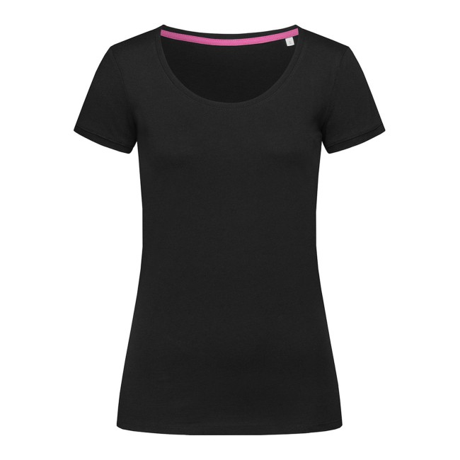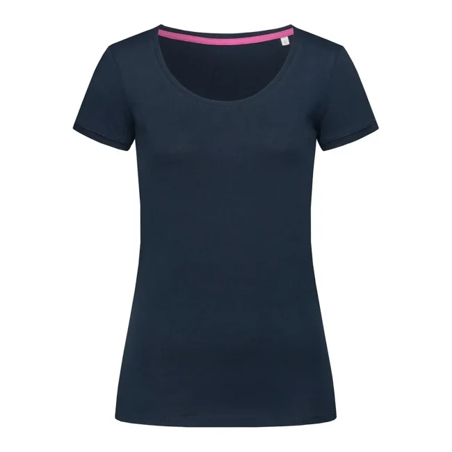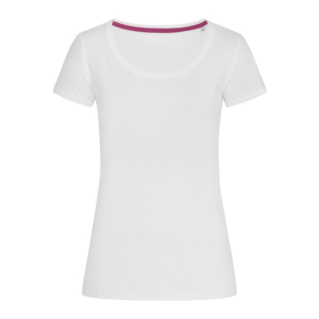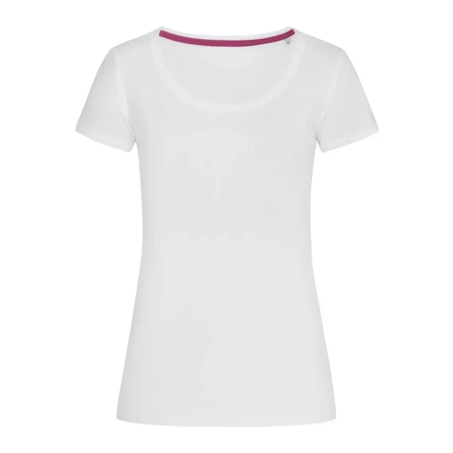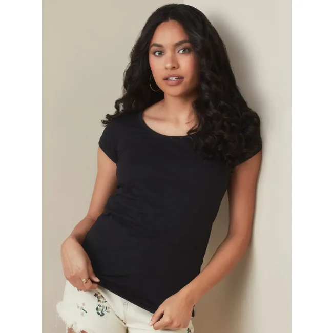 100% cotone ring-spun. Single jersey. T-shirt manica corta girocollo con fettuccia interna in colore a contrasto, ampio scollo, giromanica in costina sottile, leggermente sfiancata, struttura con cuciture laterali, etichetta strappabile, lavabile a 40°C. Col. GYH: 85% cot. 15% visc.