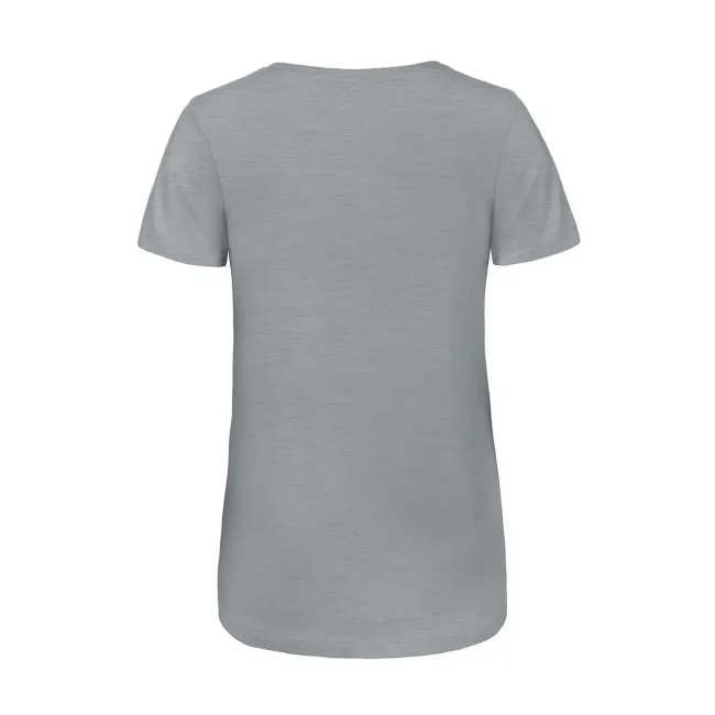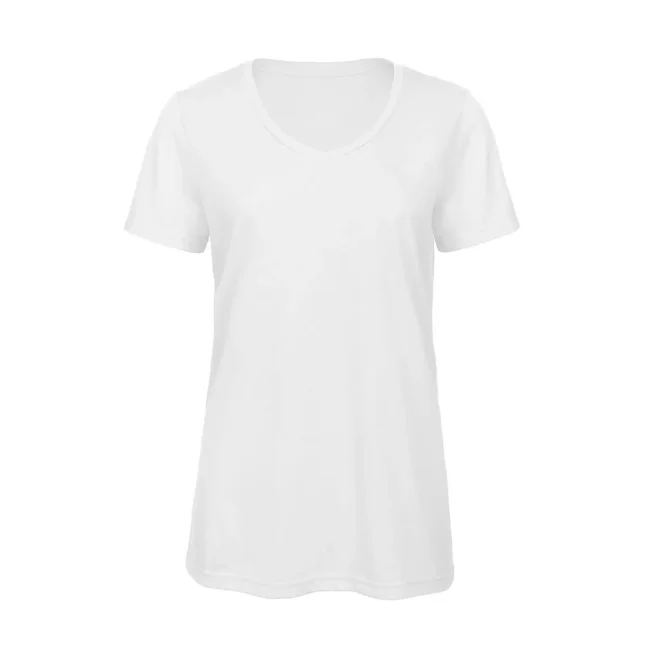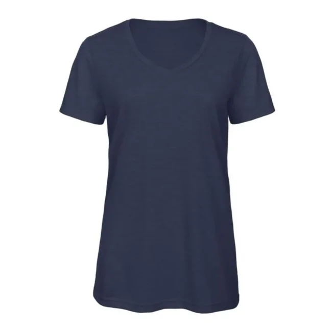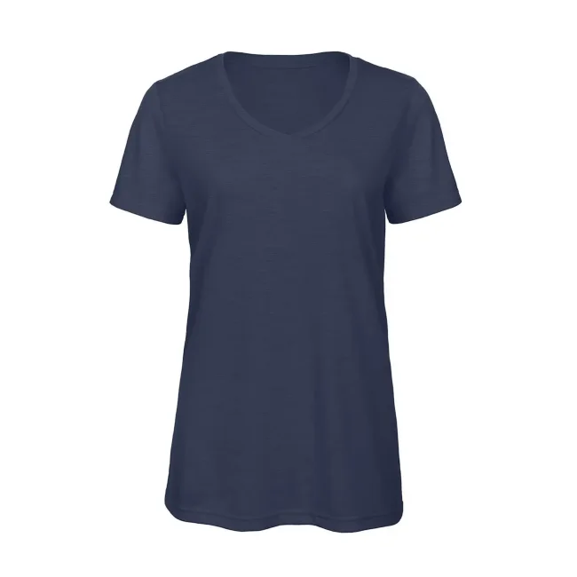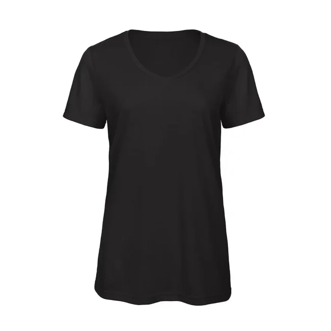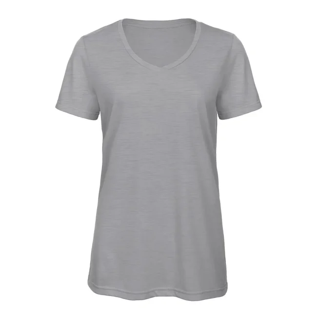T-shirt V Triblend da donna composta da 50% poliestere, 25% cotone e 25% viscosa. Caratterizzata da maniche corte set-in e scollo a V, offre una morbidezza al tatto e una buona traspirabilità. La struttura con cuciture laterali e l'assenza di etichetta la rendono perfetta per la personalizzazione con logo.