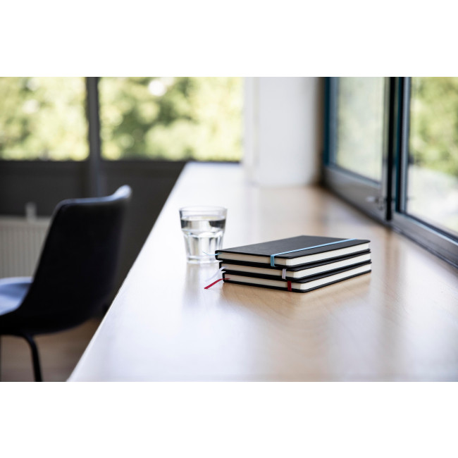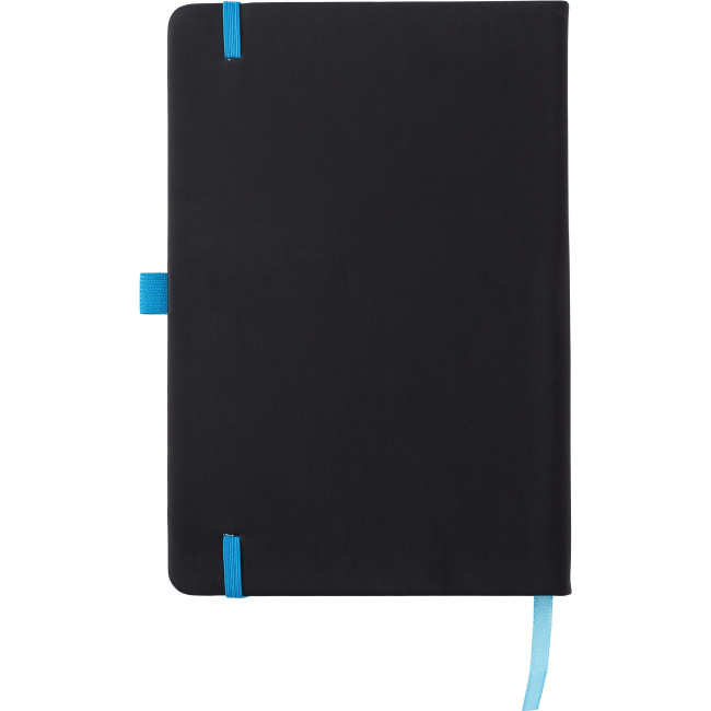 Taccuino formato +/- A5, include 96 fogli a righe, elastico colorato, passante per penna, con l'incisione laser sulla copertina il logo si mostrerà nel colore del dell'elastico, in PU