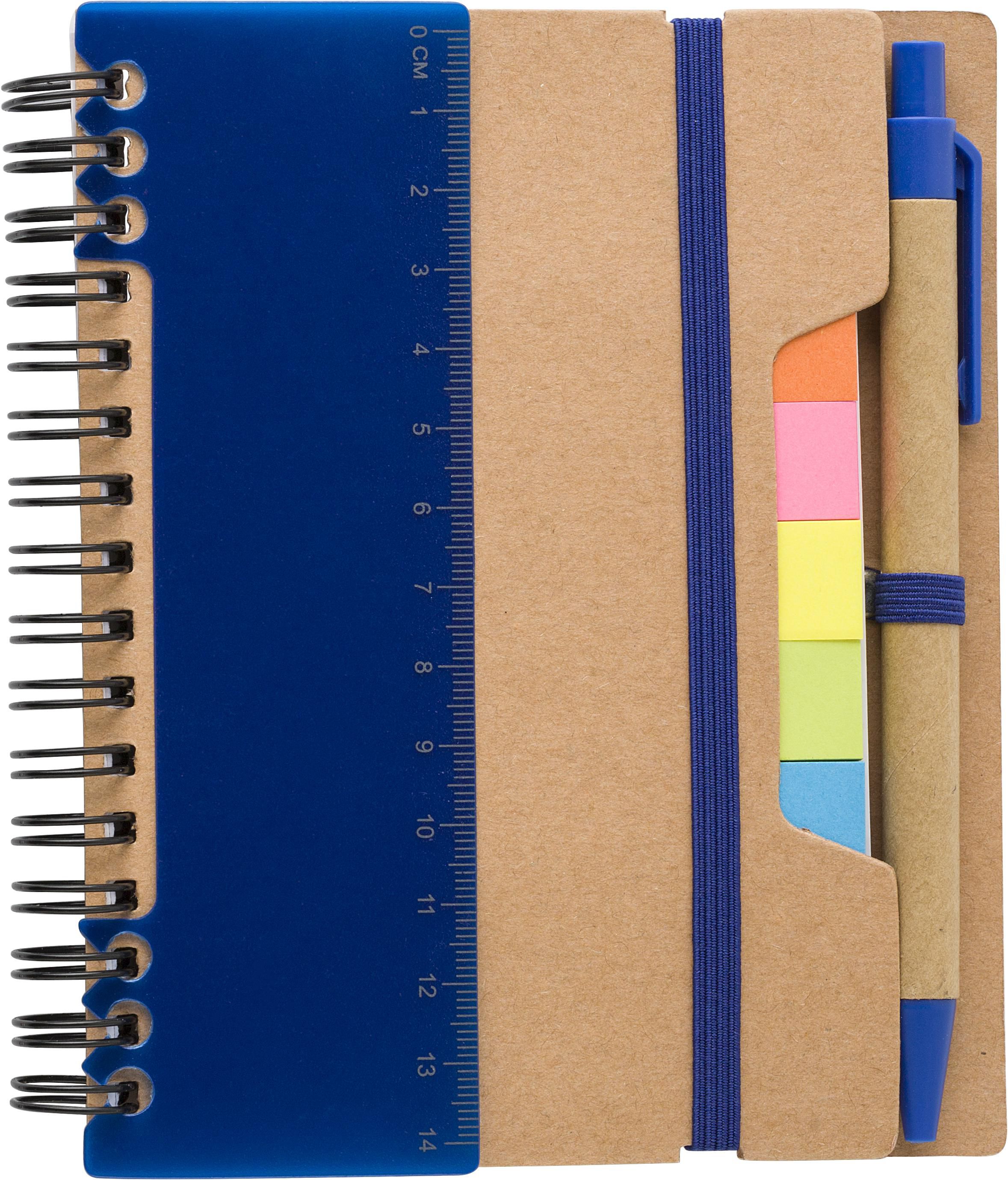 Taccuino in carta riciclata, rilegato a filo con pagine a righe, righello, memo stick in vari colori, penna a sfera, refill nero
