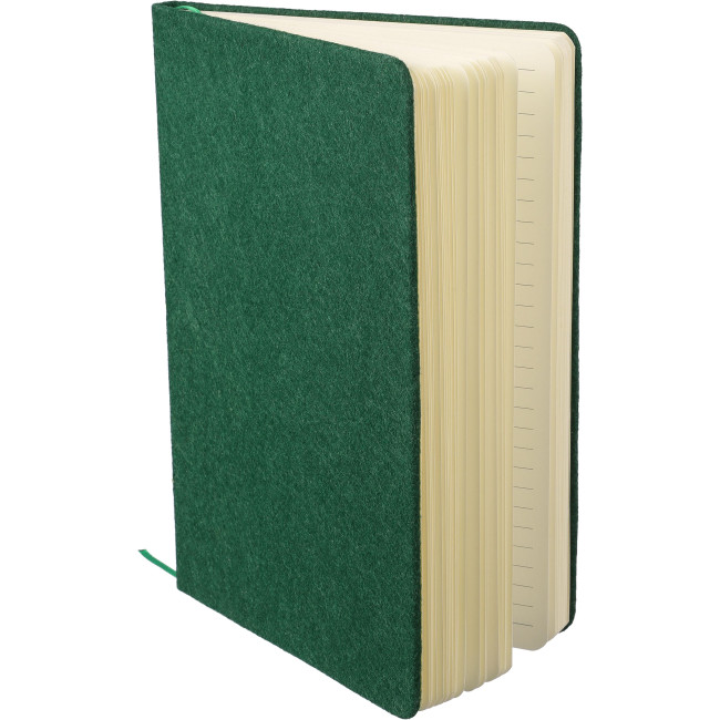 Taccuino in feltro riciclato, formato +/- A5, copertina morbida e rigida da 1 mm, dotato di una fascia elastica e chiusura esterna in PU, include segnalibro a nastro e 80 fogli di carta a righe da 70 g/m². Presenta logo riciclato inciso al laser sul retro.