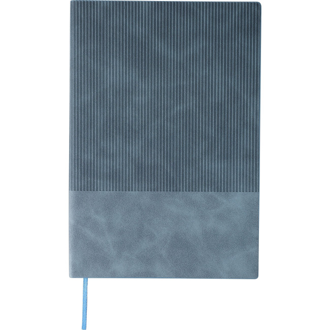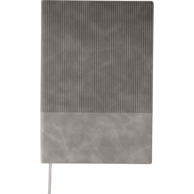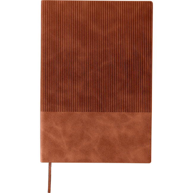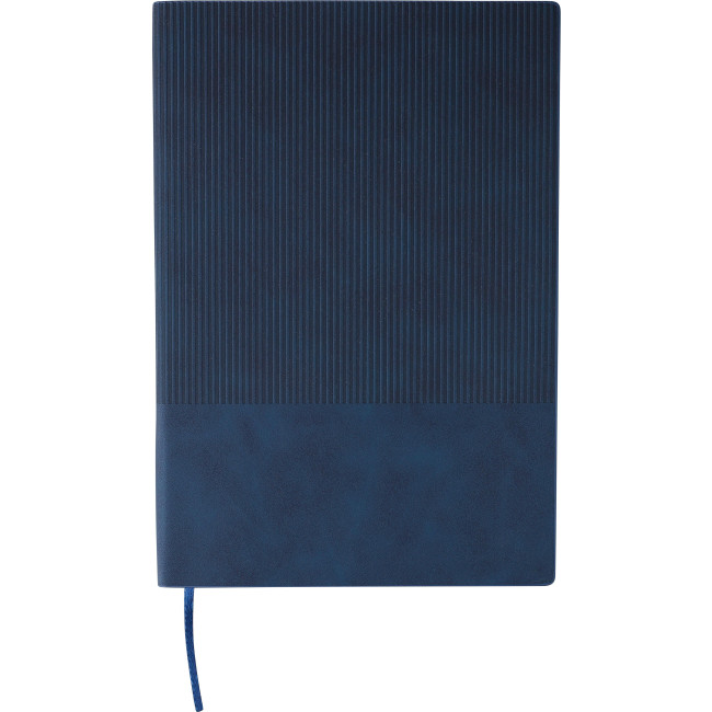 Taccuino in PU riciclato, formato +/- A5, copertina rigida e finitura effetto velluto a coste sulla parte superiore frontale e sul retro, include segnalibro e 100 pagine a righe in carta da 80 g/m². Presenta logo materiale riciclato in rilievo sul retro.