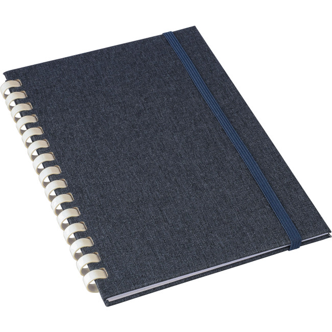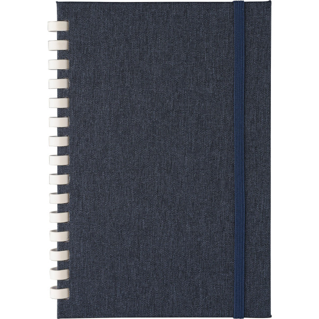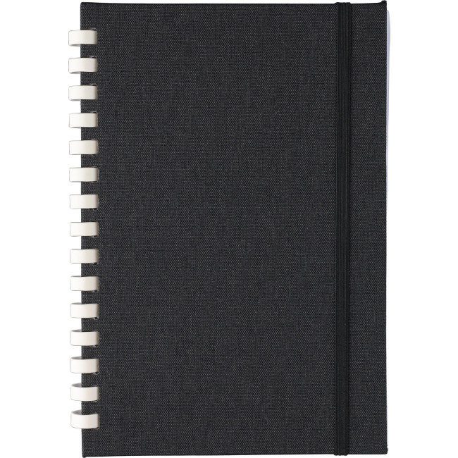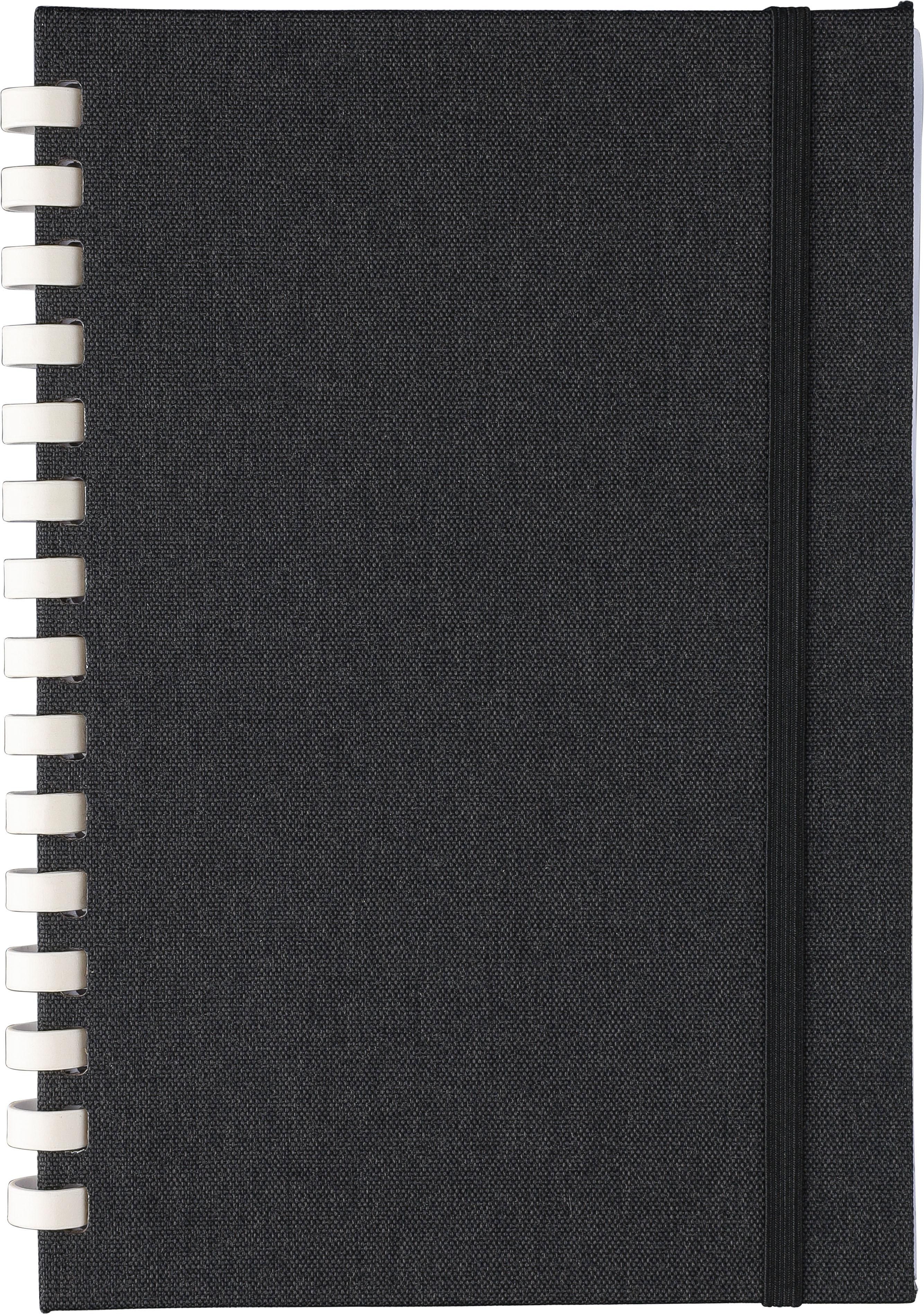 Taccuino in rPET, formato +/- A5, copertina rigida, include elastico per la chiusura, spirale in cartone bianco con 15 anelli, segnalibro a nastro e 80 fogli di carta a righe da 70 g/m². Presenta logo rPET sul retro, confezionato in carta velina, senza polybag.