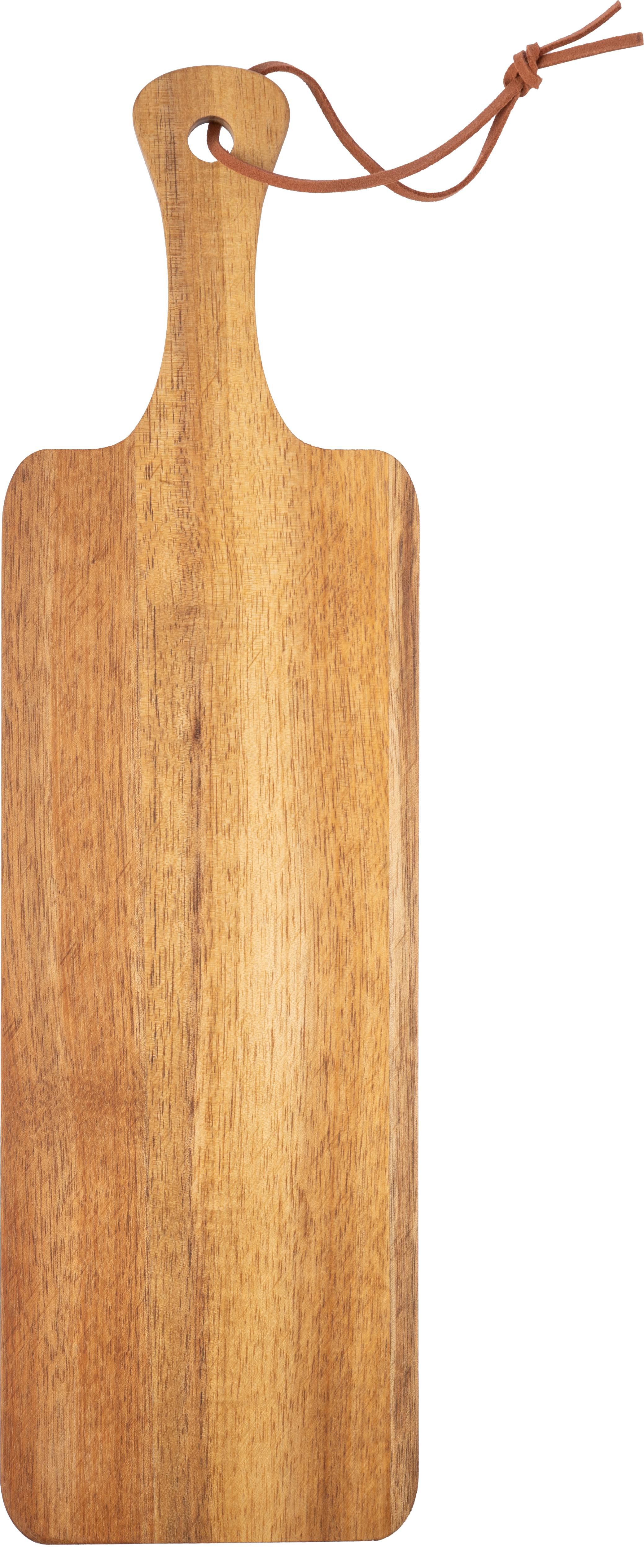 Tagliere in legno di acacia, manico e cordino in PU, confezionato singolarmente in una scatola in cartone avana