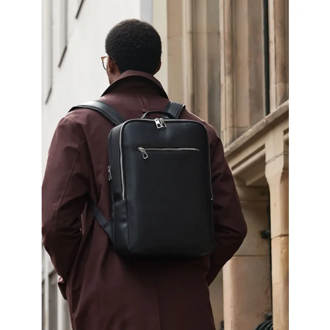 100% poliestere riciclato. Zaino per laptop fino a 16'' in poliestere riciclato certificato GRS, apertura con due zip bidirezionali, tasca frontale con zip, due tasche interne portaoggetti, porta borraccia interno, cinghia posteriore per bagaglio. Dimensioni: 28,5x40x12cm, Capienza: 10 litri. Etichetta strappabile.