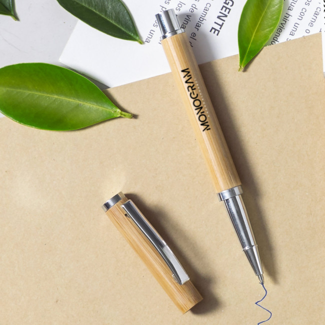 Roller con cappuccio della Linea Natura. Realizzato in bambù, con fusto rifinito in modo liscio e dettagli cromati. Cartuccia Jumbo, con inchiostro blu.