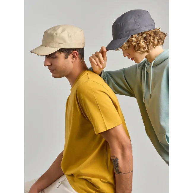 100% cotone twill. parasudore: 35% cotone, 65% poliestere. Cappellino dotato di visiera con fettuccia e 4 cuciture, chiusura con velcro a strappo, etichetta removibile, taglia unica.