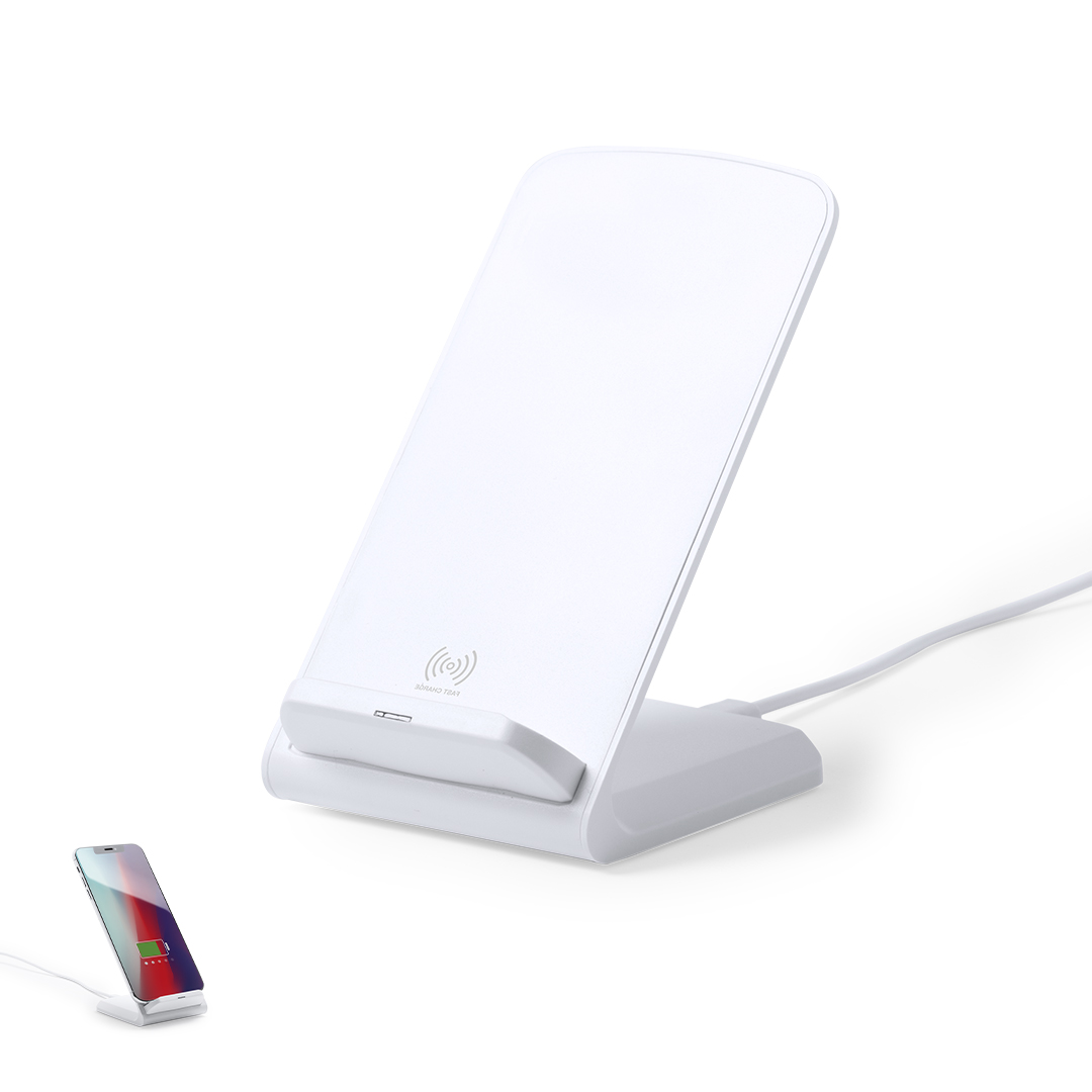 Caricabatterie wireless in elegante finitura bianca con funzione porta cellulare. Funzione di ricarica rapida da 10 W e compatibile con dispositivi dotati di tecnologia di ricarica wireless. Ampia superficie di marcatura e presentato in un'attraente scatola di design