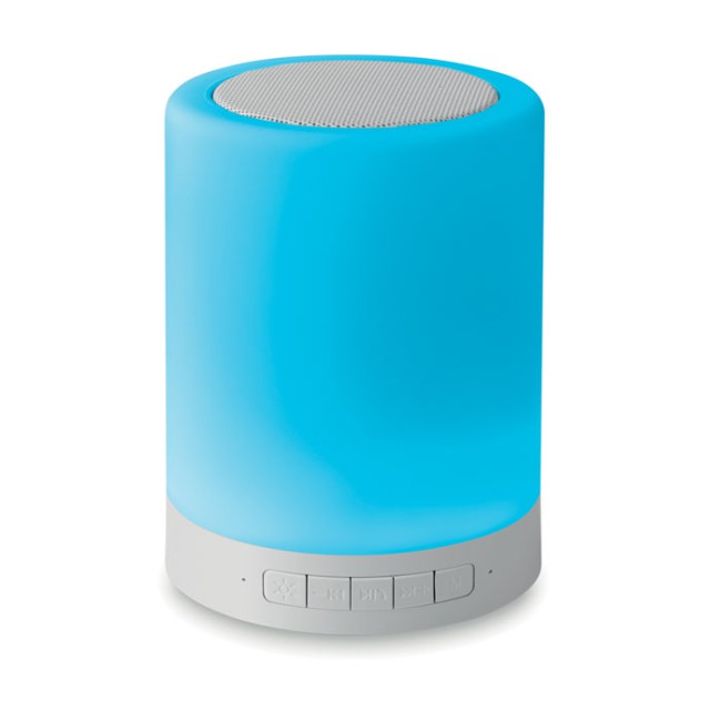 Speaker (3W) con luce da tavolo (1,6W). Toccando la lampada si modificano il colore e l'intensità della luce. Funzione chiamate. Con gancio per appendere. Autonomia circa 2h.