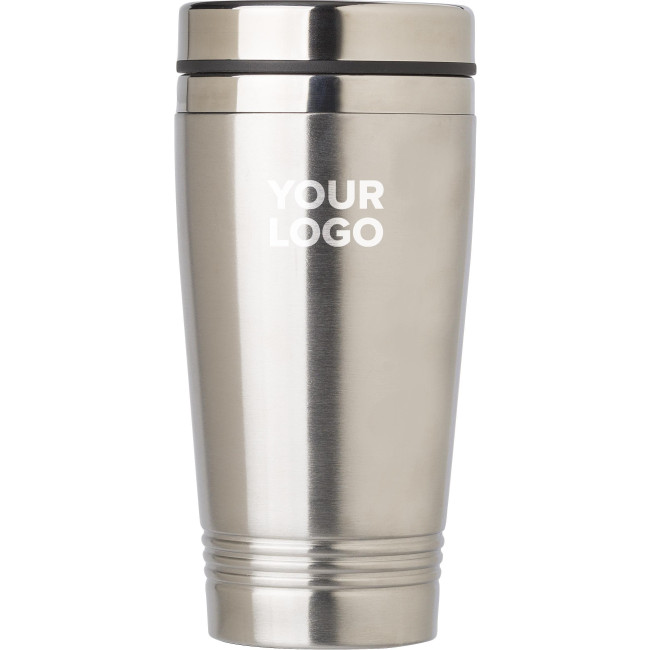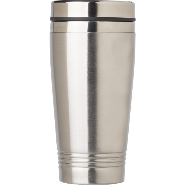 Tazza in acciaio inox, coperchio con apertura scorrevole, fondo antiscivolo, confezionati singolarmente in una scatola di cartone marrone, capacità 450 ml. Adatto per contenuti caldi fino a 70 gradi Celsius.