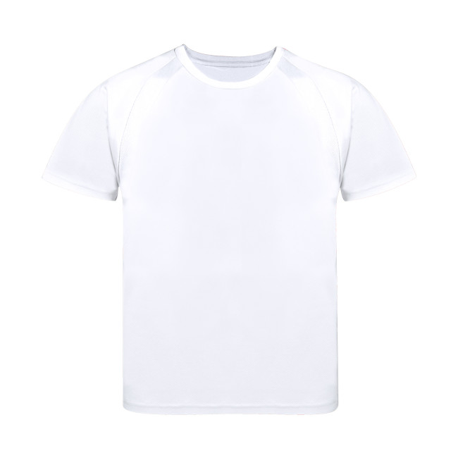 T-shirt tecnica per bambini in materiale 100% poliestere traspirante da 135 g/m2. Con maniche raglan, girocollo e bande frontali e laterali in tessuto microforato traspirante. Disponibile nelle taglie 4-5, 6-8, 10-12.