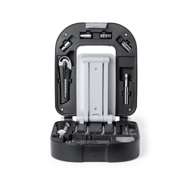 Set di attrezzi originali con luce e 30 accessori. Presentato in una robusta scatola in ABS nero con chiusura. Lampada pieghevole integrata nella scatola, con 24 LED e pulsante ON/OFF. Include un cacciavite con una moltitudine di punte piatte, a croce, torx... Con kit di cacciaviti di precisione chiavi a bussola e brugole di diverse dimensioni taglierina e flessometro da 1m. Lampada a batteria (3xAA non inclusa). Confezionato singolarmente in una scatola kraft.
