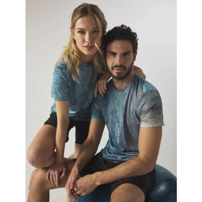 100% poliestere. T-shirt genderless maniche corte set-in, tessuto quick-dry traspirante e nastro parasudore al collo. Struttura con cuciture laterali. Etichetta removibile.