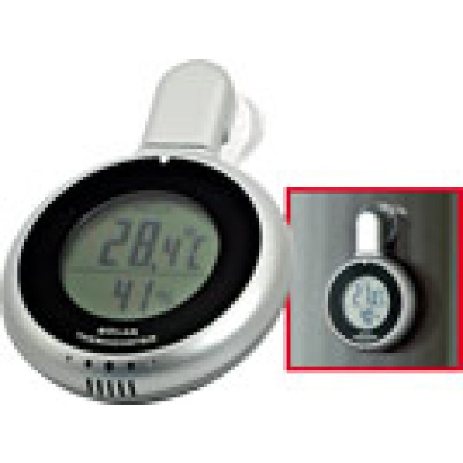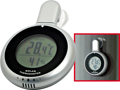 Termometro solare dotato sul retro di una ventosa per attaccarlo facilmente alla finestra. Indica la temperatura in gradi centigradi e il grado di umidit?, resistente all'acqua. Funziona ad energia solare. Confezione in scatola.