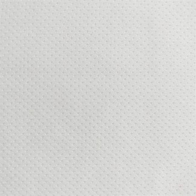 Tessuto in poliestere bianco con larghezza di 155 cm, progettato per abbigliamento tecnico e sportivo. Presenta un disegno microforato su una delle sue facce, è leggero nel movimento e nel drappeggio, e molto facile da pulire. Resa di 6,90 m²/kg, è ideale per sublimazione e accetta serigrafia, transfer e altre lavorazioni.