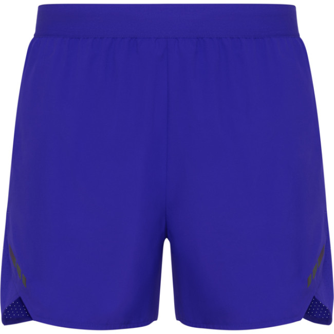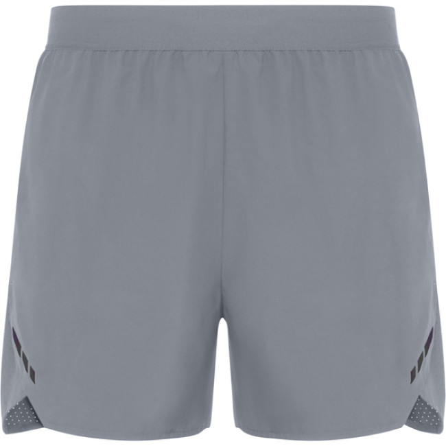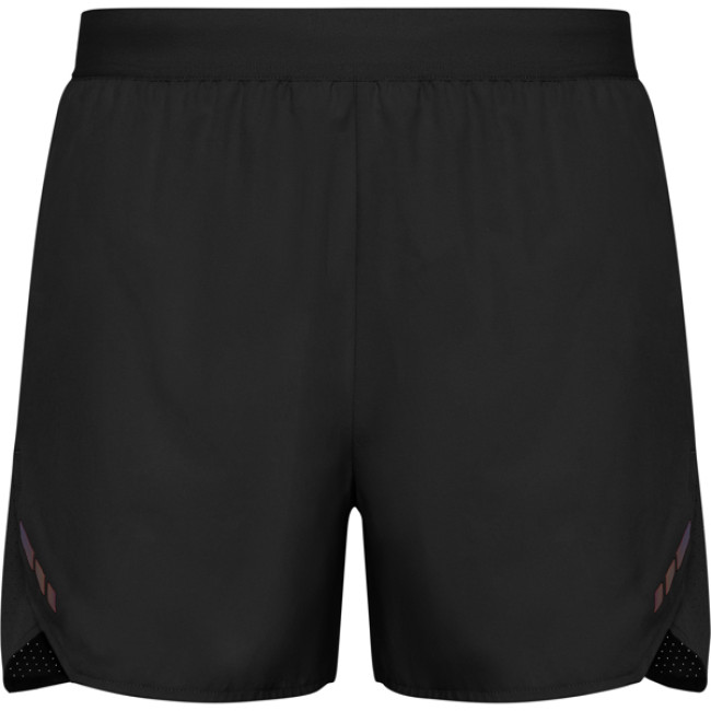 Short uomo da corsa traspiranti. Combinazione di tessuto leggero e microforato. Slip interni. Mini tasca laterale con zip invisibile. Girovita elasticizzato con cordoncino interno. Dettagli riflettenti sui lati anteriori. Certificazione GRS.