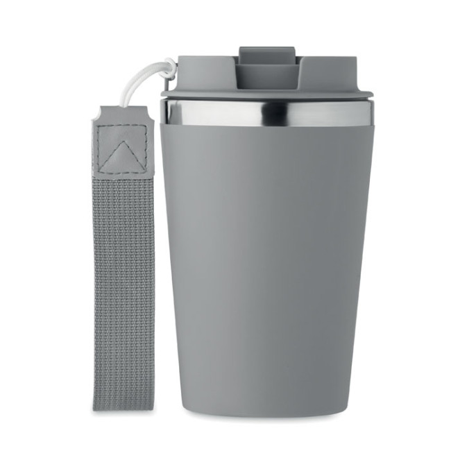 Bicchiere a doppio strato in acciaio inox riciclato (90% acciaio inox riciclato e 10% acciaio inox) con strato esterno in PP e cinturino in RPET. Capacità: 350 ml.