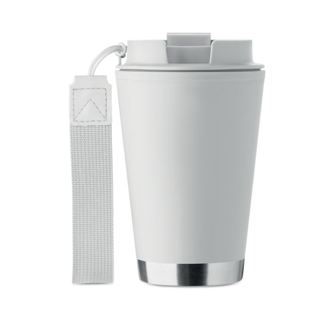 Bicchiere a doppio strato con parete interna in PP, parete esterna in PP riciclato, dettagli in acciaio inox riciclato e cinturino da polso in RPET. Capacità: 300 ml.