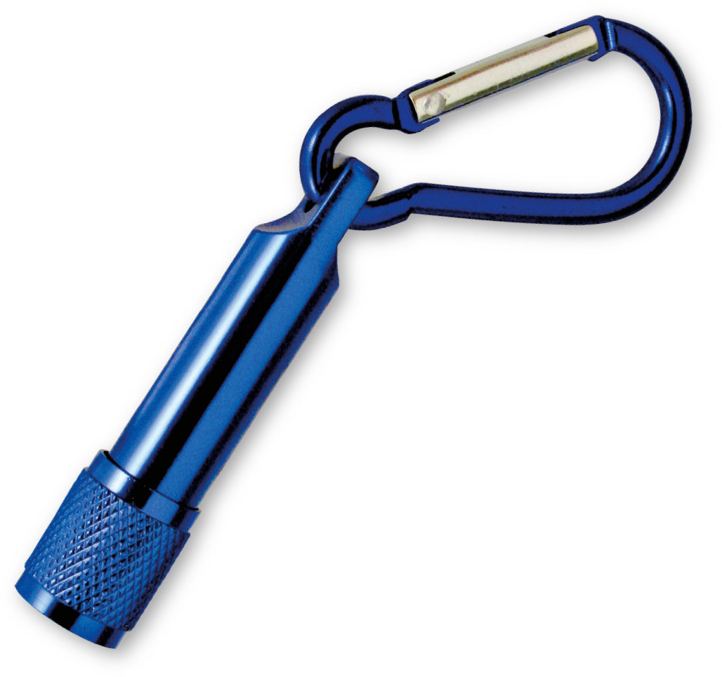 Torcia con moschettone in alluminio colorato. Confezione in polybag.