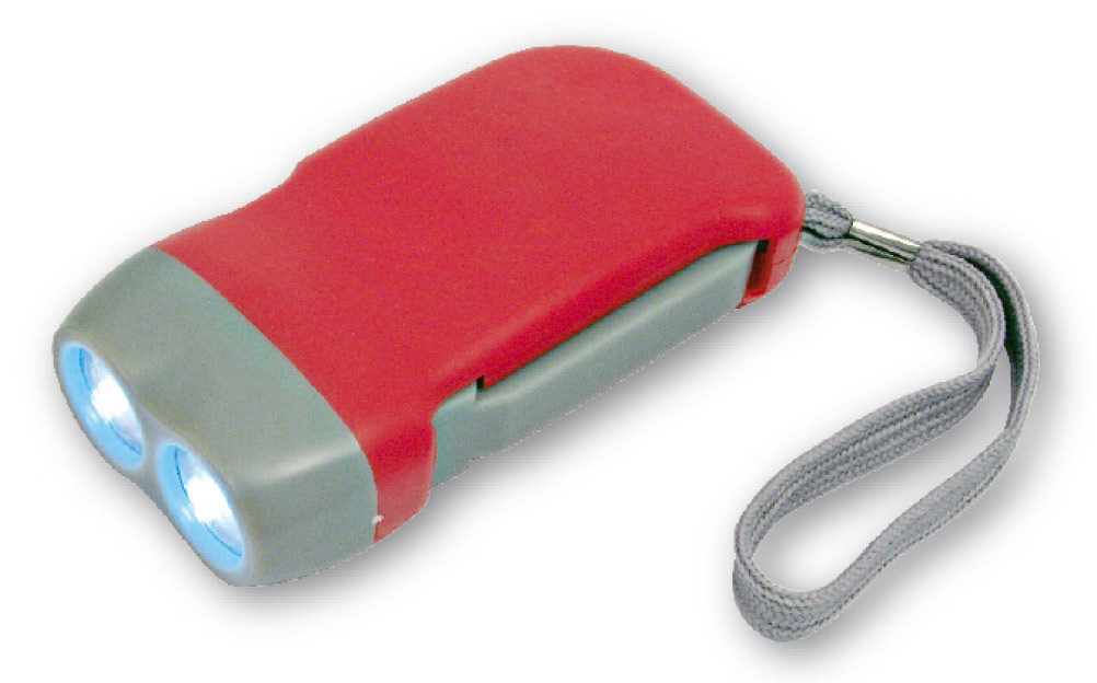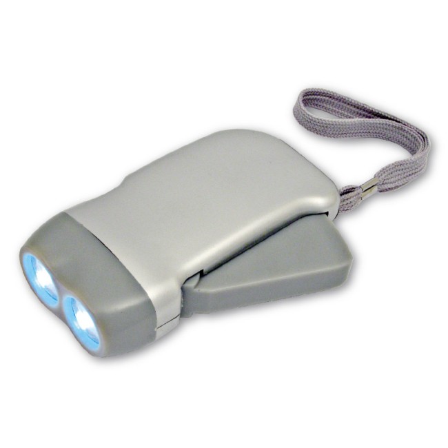 Torcia dinamo, ricaricabile a mano, doppio led ad alta luminosita', accumulatore di energia. Tasto blocco e sblocco manopola. Pratico laccetto. Confezione in cartoncino.