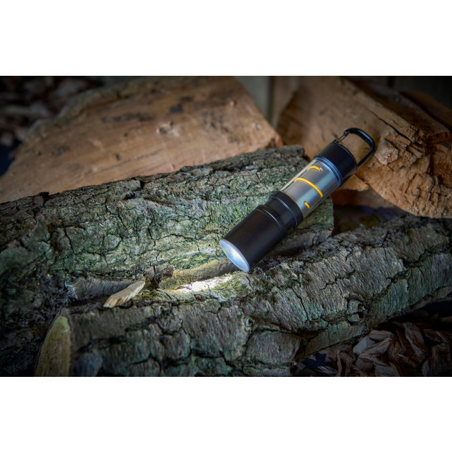 Torcia COB in alluminio e lega con custodia in ABS e clip in metallo sul retro. Dispone di 3 funzioni luminose, modalità zoom e un moschettone nero sul lato superiore. Alimentato da una batteria agli ioni di litio da 500 mAh con ricarica Type-C. Offre 130 lumen e include un cavo nero di 30 cm. Funzionamento a pulsante. Confezionata singolarmente in una scatola di cartone avana.