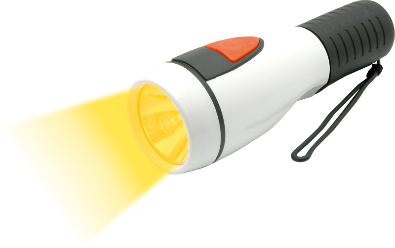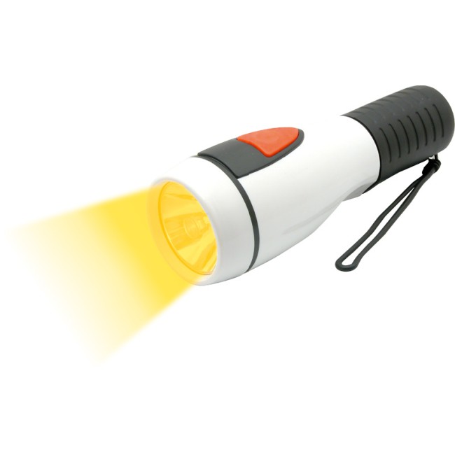 Torcia in plastica bianca impugnatura in gomma nera, funzionamento a batterie non incluse. Confezione in scatola.