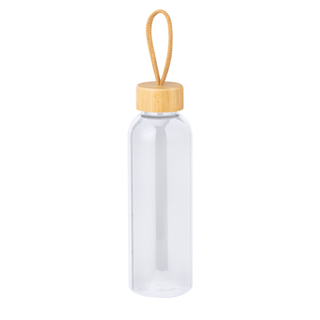 Borraccia in RPET da 650 ml, BPA Free. Tappo a vite in bambù, con cordino intrecciato. Disponibile in un'ampia gamma di colori. Presentata singolarmente in una sacchetto di carta.