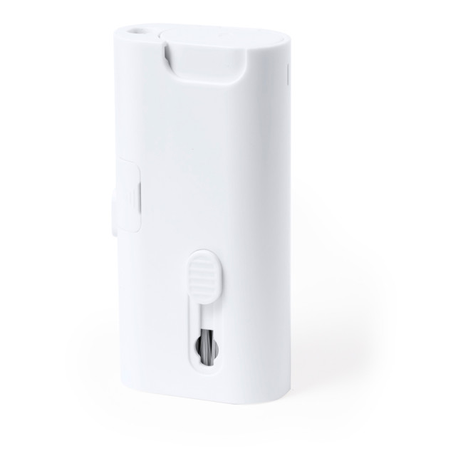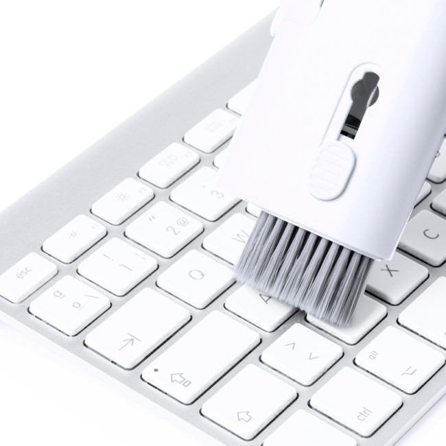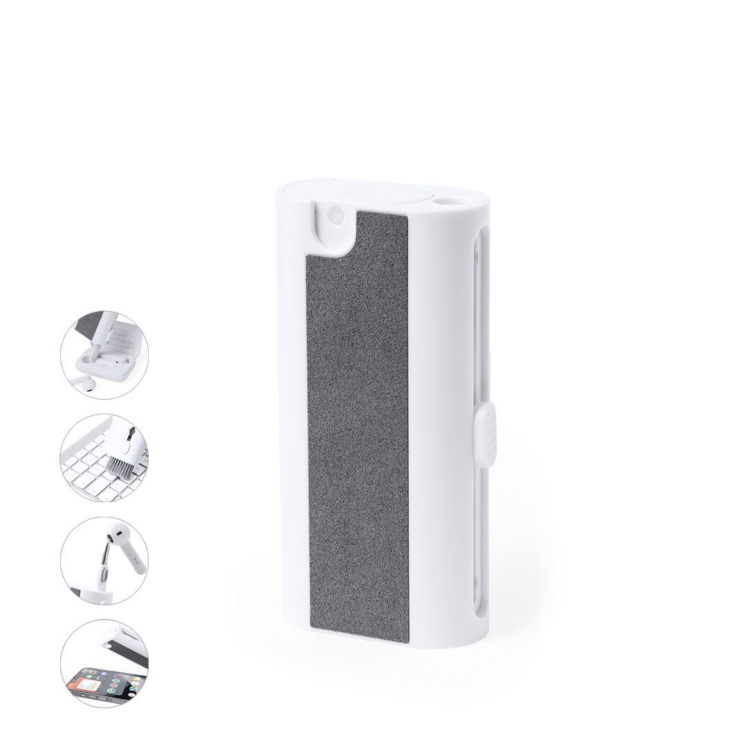 Set completo di pulizia a 6 funzioni, appositamente studiato per la cura e la manutenzione dei gadget tecnologici. Tutti gli accessori sono alloggiati all'interno della custodia e sono pronti all'uso facendo scorrere il pulsante corrispondente a ciascuno di essi. Include serbatoio interno ricaricabile con spruzzatore, area di pulizia dello schermo, punta in metallo, bastoncino di pulizia, spazzole di diverse forme e accessorio per la rimozione dei tasti. Realizzato in resistente ABS, con elegante design bianco e presentato singolarmente in una scatola kraft di design.