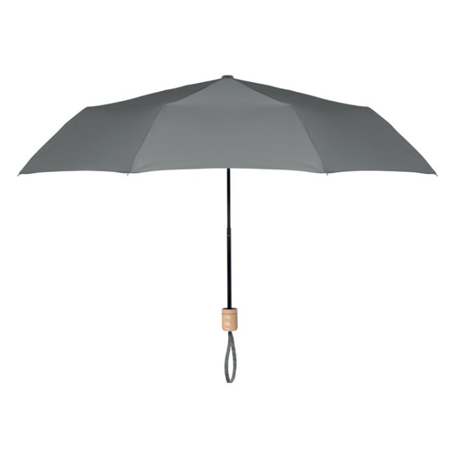 Ombrello 21'' pieghevole, 3 sezioni con tessuto pongee RPET da 190T. Struttura placcata nera e nervature con manico in legno. Apertura e chiusura manuale. Sacca nello stessomateriale.