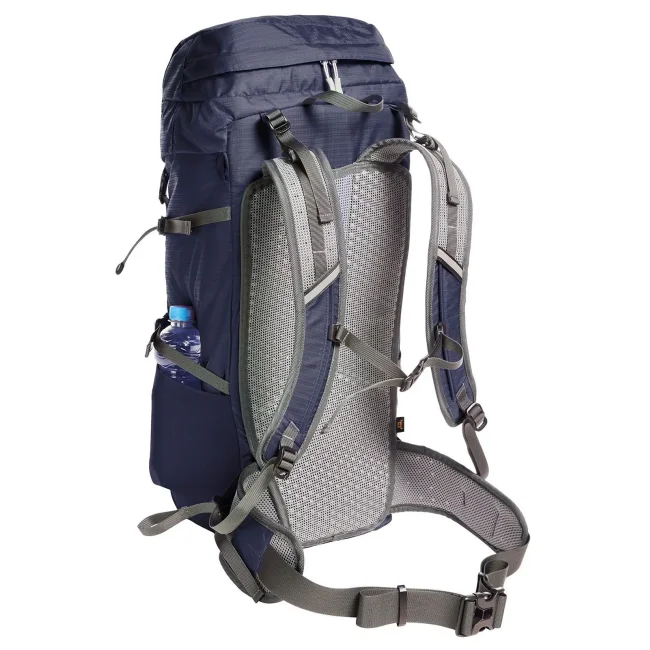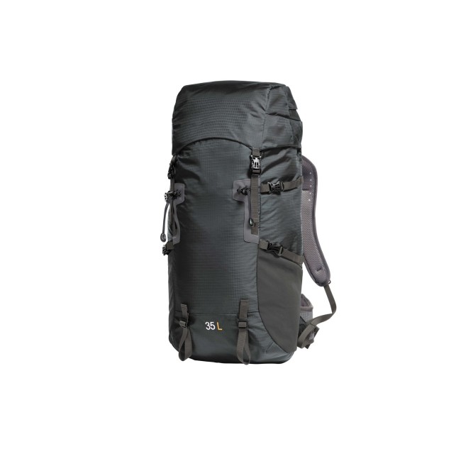100% Nylon 210d. Zaino con sistema di bretelle regolabili, cinghia al petto regolabile in altezza, cinturino imbottito in vita. Dimensioni: 29 x 66 x 21 cm, capacita': 35 litri, area di stampa: 6.5 x 30 cm.