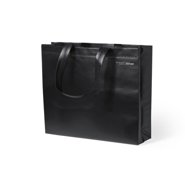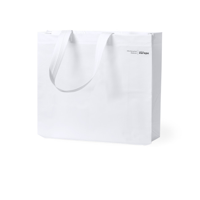 Borsa della linea Natuae, realizzata in TNT riciclato 120g/m2 laminato. Prodotta in Europa, con finitura termosaldata, soffietto, manici lunghi ed etichetta eco/made in sulla borsa.
