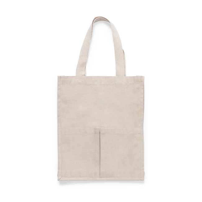 Borsa realizzata in cotone, finitura naturale e peso extra di 310g/m2. Con due tasche esterne, cucite e con soffietto. Manici medi extra larghi e rinforzati (58 x 3,5 cm). Resistenza fino a 10 kg di peso.