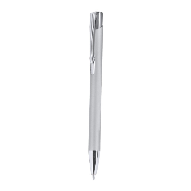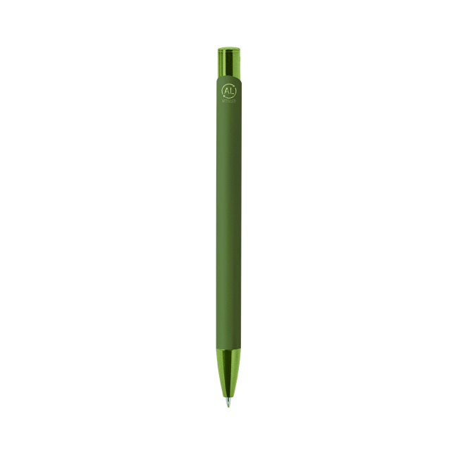 Penna a meccanismo a pulsante. Rifinita in alluminio riciclato gommoso, cartuccia jumbo e inchiostro blu. Progetto speciale per l'incisione laser con effetto specchio. Con il distintivo logo di Recycled Aluminium.