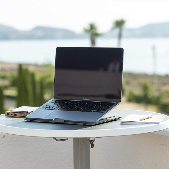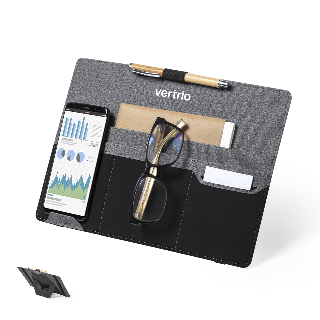 Elegante e pratico organizer con supporto magnetizzato, ideale per facilitare il lavoro o l'uso del computer portatile in qualsiasi luogo o spazio. Realizzato in resistente poliestere grigio marmorizzato con dettagli in similpelle nera. Include portapenne e porta smartphone, con 4 tasche elastiche per riporre vari gadget.