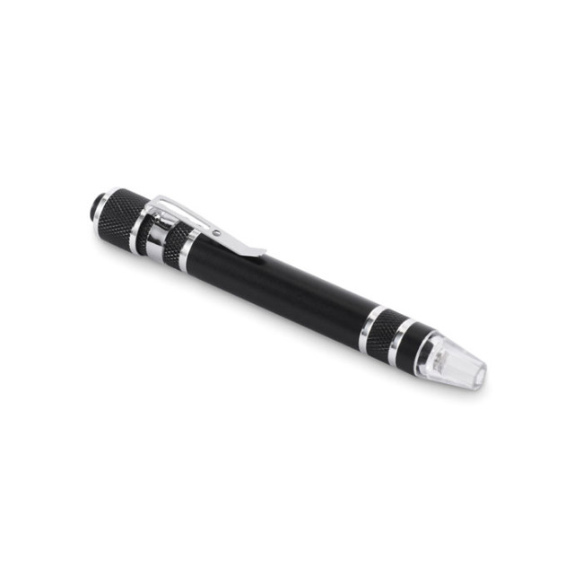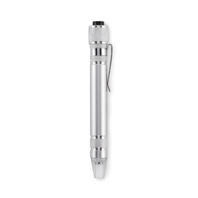 Multiutensile in alluminio riciclato a forma di penna con torcia. Include 3 cacciaviti a taglio e 3 cacciavite a croce. 4 batterie a bottone LR41 incluse.