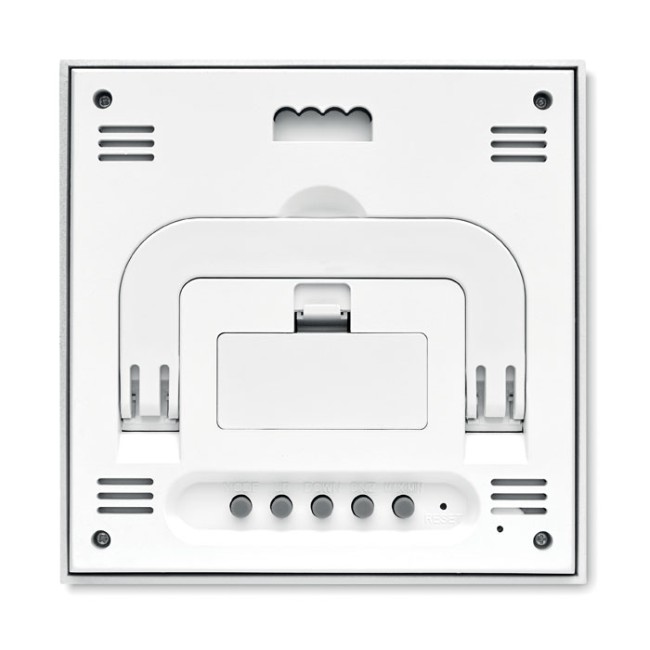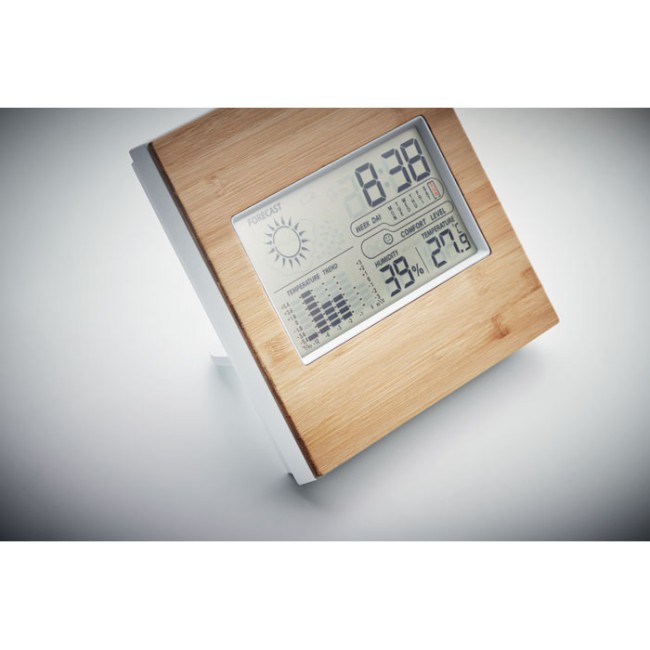 Termometro multifunzione con frontale in bamboo. Include orologio, indicazione temperatura, visualizzazione dell'umidità e calendario. 2 batterie AAA non incluse. Il bamboo è un prodotto naturale, potrebbero esserci lievi variazioni di colore e dimensioni tra un articolo e l'altro, che possono influire sul risultato finale della personalizzazione.