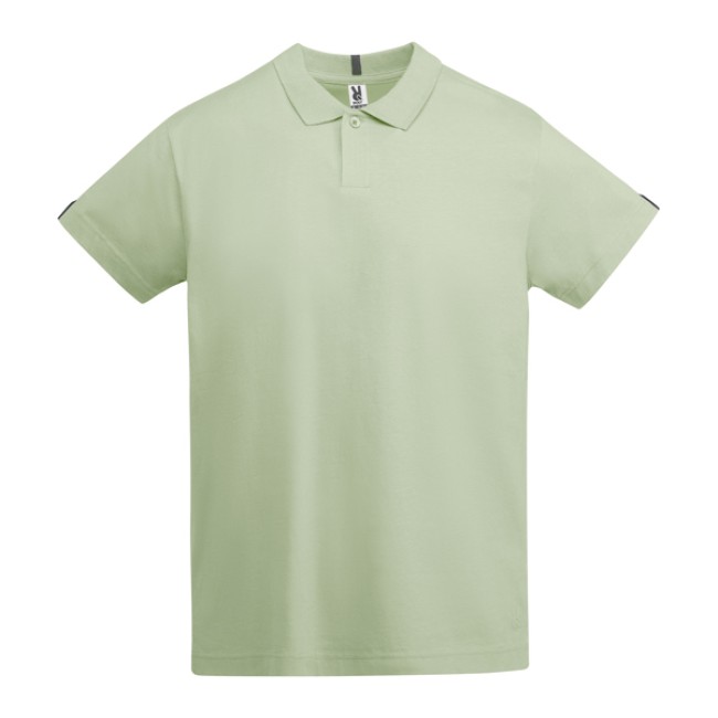 Polo a maniche corte in tessuto a maglia tinta unita. Colletto e bordi delle maniche in costina 1x1. Abbottonatura a 1 bottone. Copri cuciture rinforzate sul colletto. Spacchi laterali sull'orlo. Nastro a spina di pesce a contrasto su polsini e colletto. Logo Roly in rilievo dello stesso colore della base del tessuto.